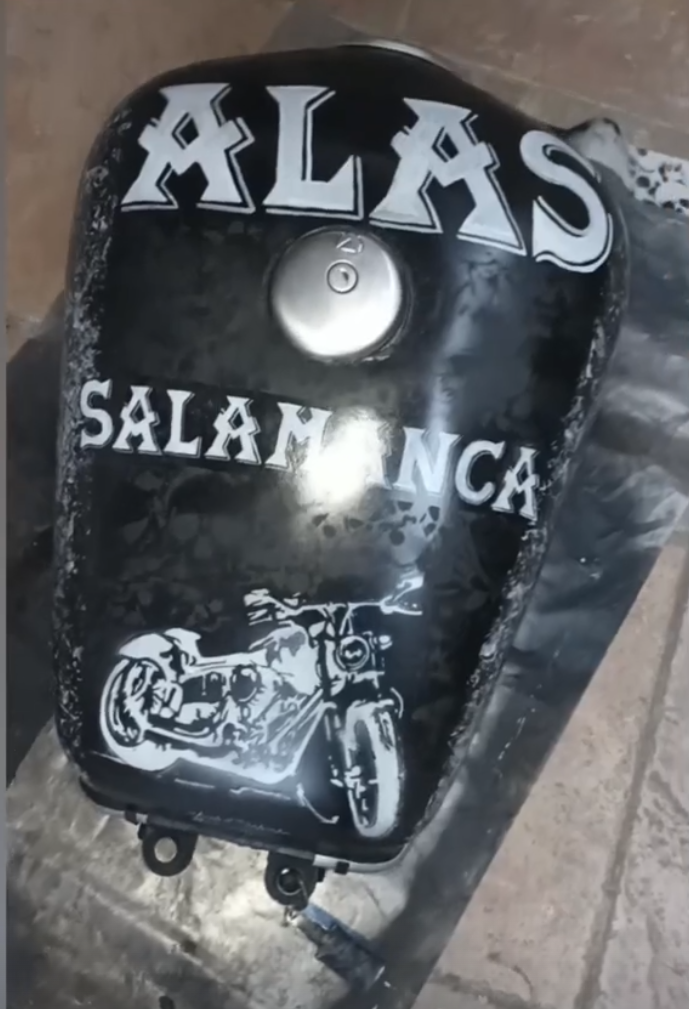 lettering “ALAS Salamanca” y silueta de moto, efecto desgaste
